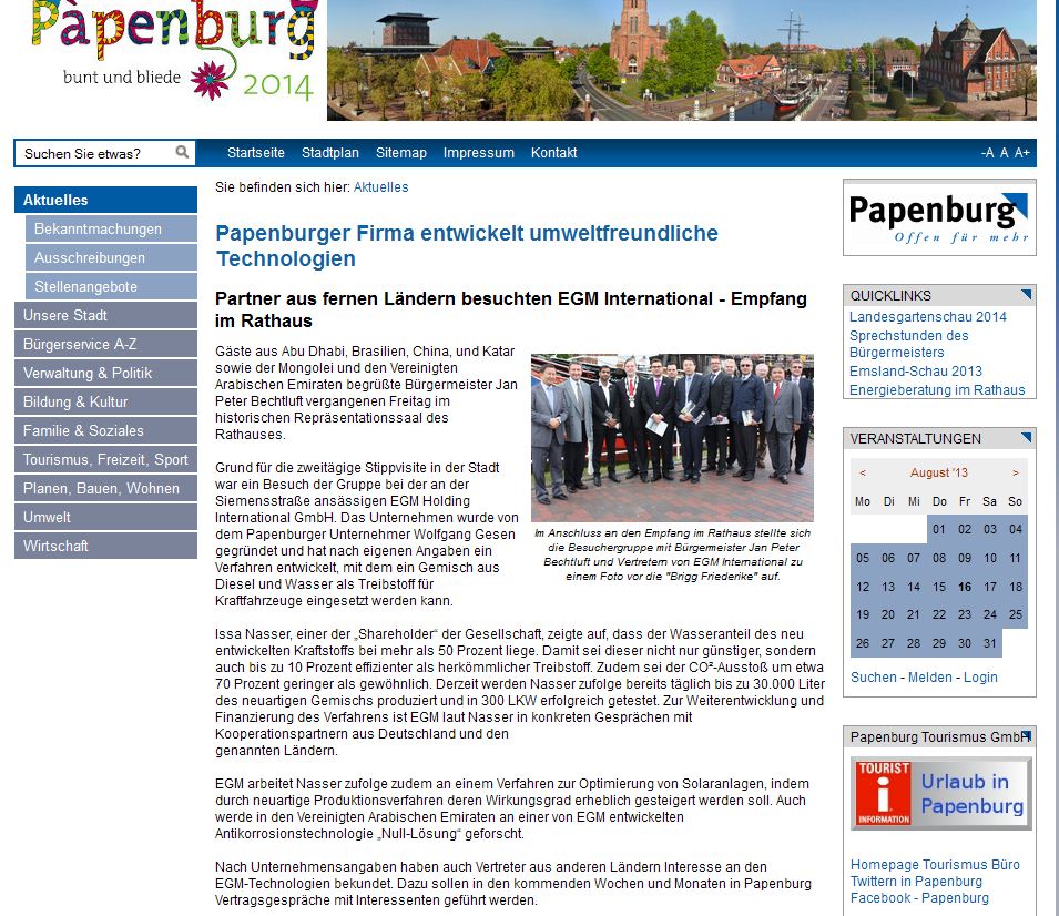 In Papenburg ein buntes Stelldichein mit Delegationen von Abu-Dhabi bis China, um Verhandlungen zu führen mit einer Firma, welche es geschafft hat, einen Kraftstoff zu entwickeln, welcher zu über 50% aus